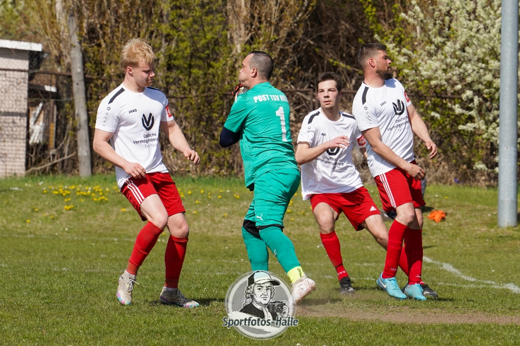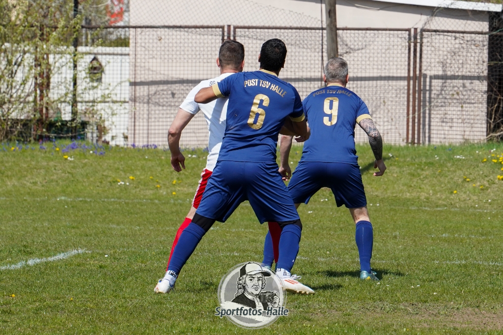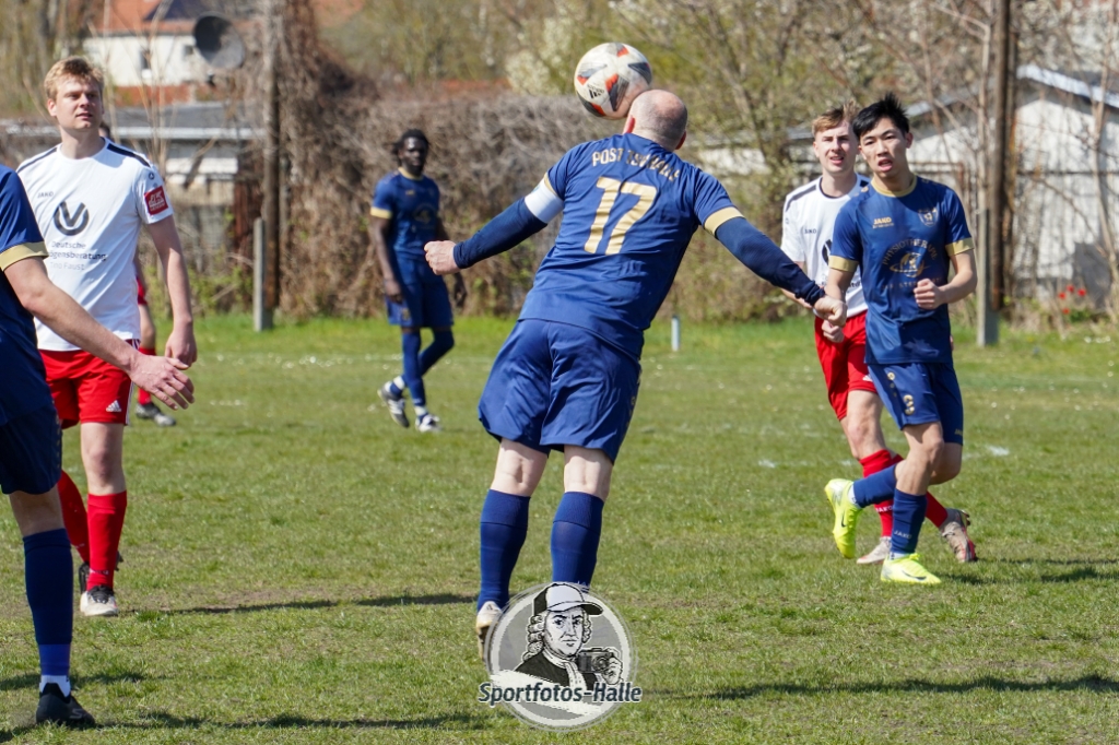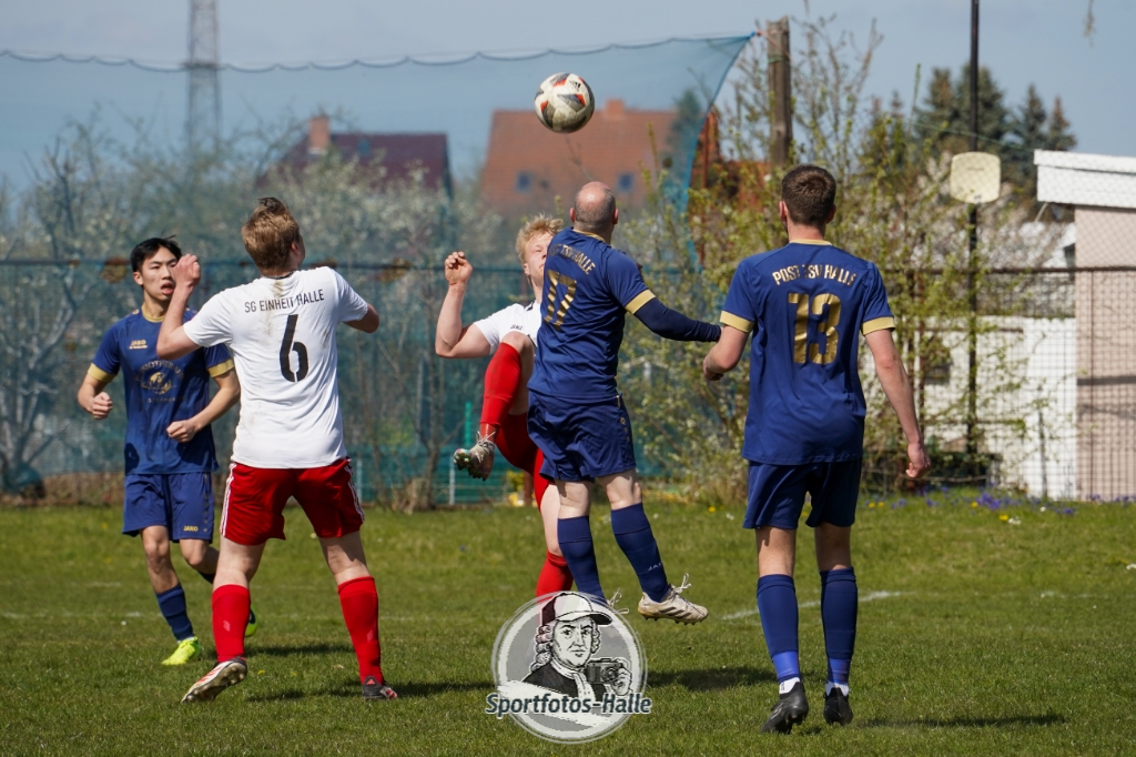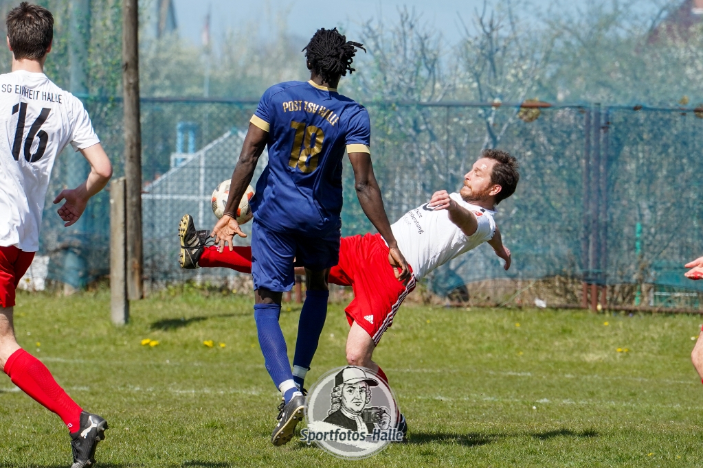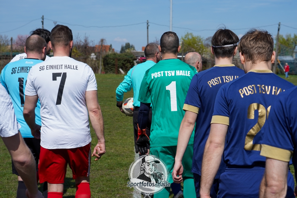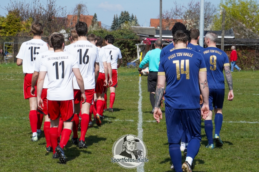 Den besseren Start erwischte der Post TSV Halle: In der 13. Minute brachte Cheikhna Sadibou Diouf seine Mannschaft mit 1:0 in Führung. Nur neun Minuten später erhöhte er mit seinem zweiten Treffer auf 2:0 (22.). Kurz vor der Pause kam die SG Einheit Halle durch Florian Hilprecht zum Anschlusstreffer (43.) und hielt die Partie damit offen.